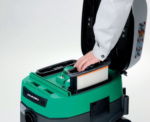Industrijski sesalnik RP350YDH HiKOKI ima tako imenovani I-PULSE sistem za samodejno čiščenje filtra z uporabo stresanja tudi med delovanjem sesalca.